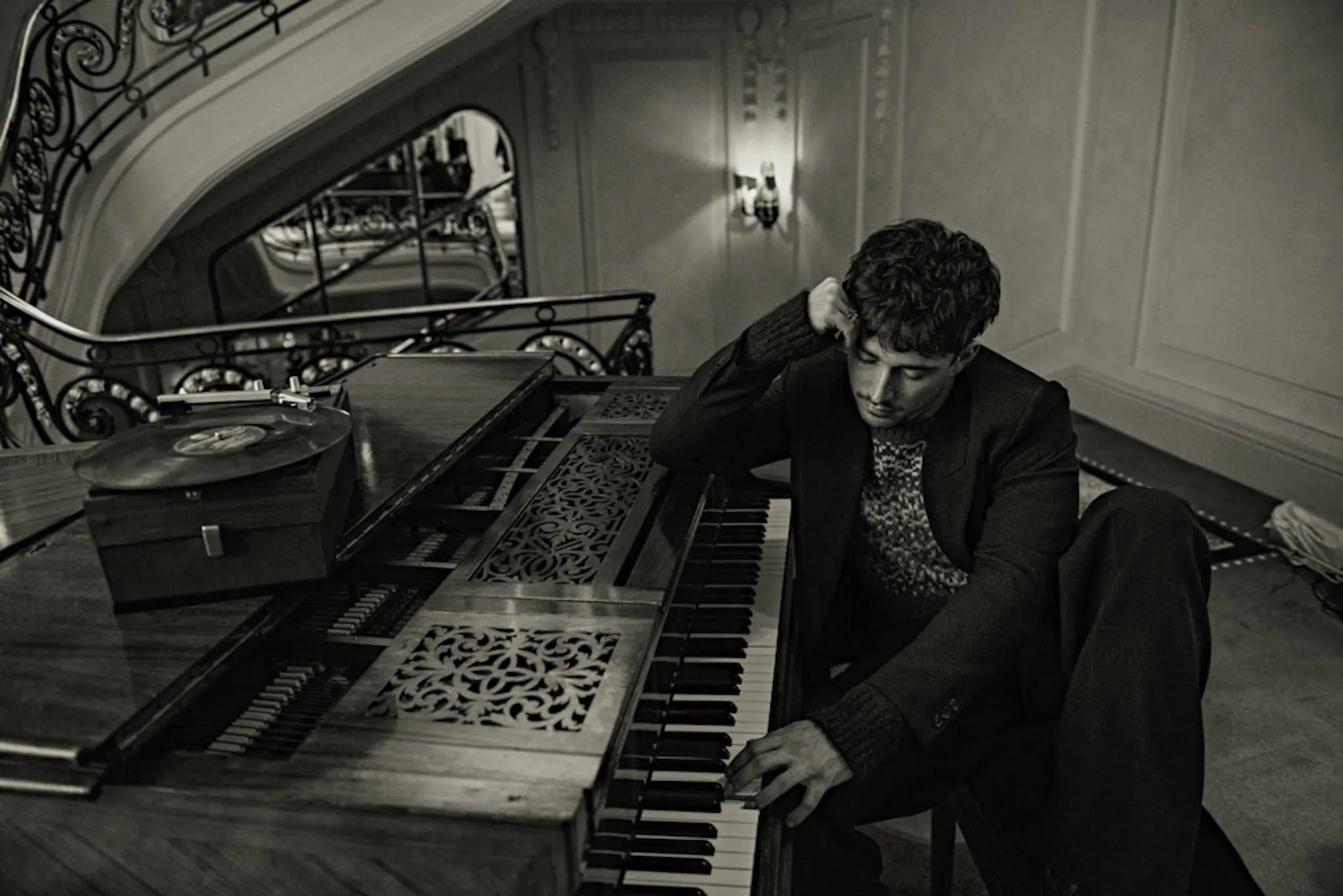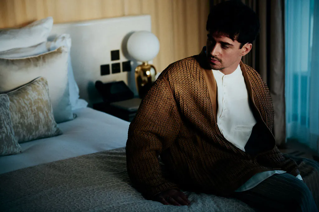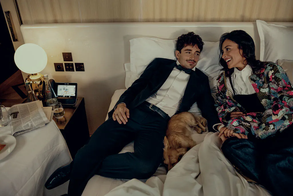 « C’était pile le jour où on emménageait », dit-il. Une manière de célébrer un commencement, avec la Méditerranée pour témoin ! Difficile de ne pas être flatté d’entrer ainsi dans l’intimité du couple le plus glamour du moment, à quelques semaines de célébrer leur mariage. « Venez, entrez », dit le jeune homme, passant négligemment sa main dans les cheveux, allure décontractée, jean écorché et gilet de laine. Il a gardé dans ses yeux espiègles des éclats d’enfance. Sa silhouette, discrètement athlétique, frappe par ses larges épaules. Le pilote a beau être un « assis » qui va vite, il ne doit pas mollir pour dompter des bolides de kevlar et fibres de carbone, fonçant dans un vacarme d’enfer. Charles donne le sentiment d’être une force qui va (vite). Le champion, plébiscité par des millions de followers, ne fanfaronne pas pour autant. Il me précède. Je remarque à droite une énorme bouteille de champagne, un mathusalem (ou un balthazar ?), siglée Ferrari, à côté du casque rouge de l’exploit. Un vrai petit temple domestique, en souvenir de la victoire mythique au Grand Prix de Monaco 2024. Et elle le vaut bien ! Le Prince Albert II avait pleuré en prenant dans ses bras l’enfant du pays. Comment oublier cette émotion, encore visible sur YouTube ? La joie surréelle de Charles. Les yeux qui s’embuent en sortant du tunnel quand il comprend, à deux tours de l’arrivée, qu’il est en train de gagner, en surmontant enfin cette satanée malédiction du Grand Prix de Monaco où les pilotes perdent si souvent les pédales ! Il réalise son rêve : triompher dans sa ville, sur ce circuit bourré de souvenirs d’enfance ! Il faut l’entendre hurler dans son casque des « yeahhh » déchirants !