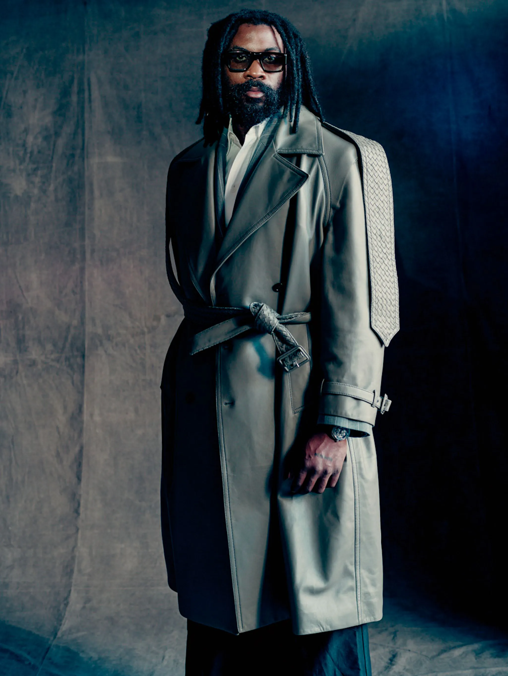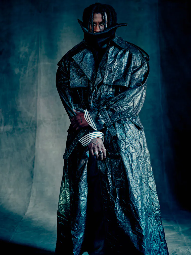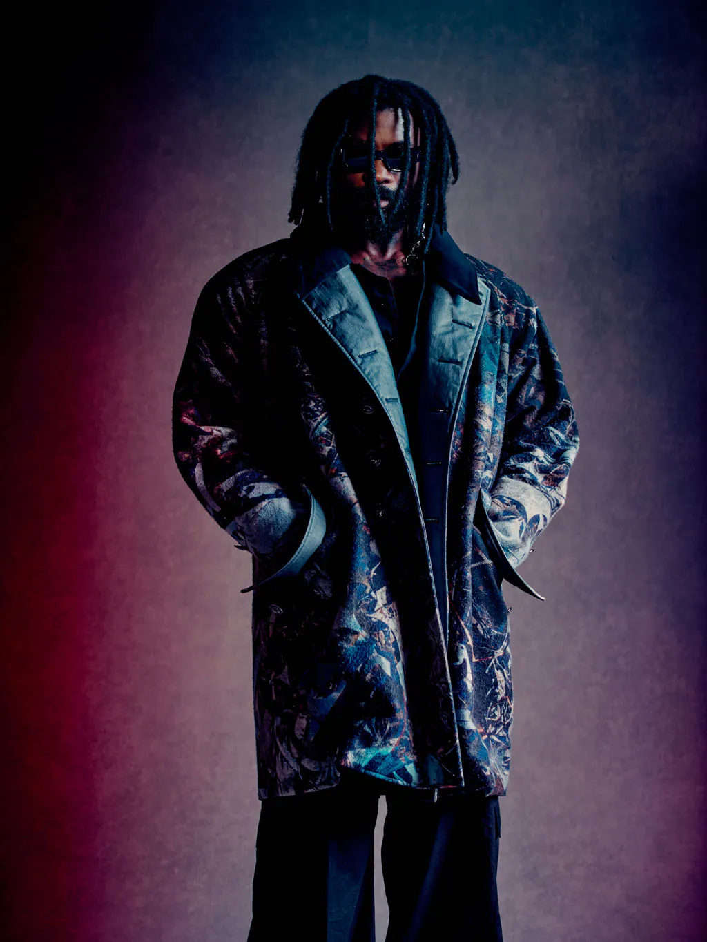 Les staffs s’affairent, vont et viennent d’un étage à l’autre. Une star du rap et une légende de la photographie sont deux capitaines entourés de toute une équipe. L’escalier ne désemplit pas. A chaque niveau sa fonction : bureau-bibliothèque aux milliers de livres, terrasse pour faire une pause, salle d’essayages où des dizaines de vêtements s’alignent sur des penderies mobiles, et le studio proprement dit, dépouillé, avec cette toile grise, tendue sur le mur du fond, qui est une des signatures de Paolo Roversi. Quand Damso sort de l’espace qui lui a été réservé, sa haute silhouette longiligne domine tout le monde d’au moins une demi-tête. Sa présence ici n’a rien pour surprendre. Il est un habitué des défilés de mode, où ses apparitions sont guettées et déchaînent les stories des badauds. Dans l’œil de Roversi, il ne fait pas mentir sa réputation, bien établie, d’être l’un des artistes les plus stylés du moment. Il y a déjà longtemps qu’on le voit porter avec autant de recherche, de soin sartorial et d’attention aux circonstances, un smoking ou un sweat à capuche, un manteau croisé à larges revers ou un sobre t-shirt noir, une chemise blanche ou une pièce hors norme d’un créateur contemporain. Je le retrouve à la fin du shooting dans une petite pièce blanche, tout en haut du studio, sous les toits. J’ai eu envie de lui donner un livre de philo que j’ai écrit en 2024, sur la « réminiscence » – de Platon à Proust et à YouTube. Il y a des choses sur la musique et les bouffées de souvenir qu’elle provoque. Rien de précis sur le rap, mais à en croire Jankélévitch, et je le crois, toute musique quelle qu’elle soit est mélancolique. Sur la page de garde, en guise de dédicace, j’ai recopié deux lignes d’une chanson de Damso : « Le temps j’aimerais pouvoir le manier/ Trouver les graines du sablier… » Main sur le cœur, accolade chaleureuse, il me dit que ça le touche beaucoup, et qu’il « adore la philo ». On s’assied, de part et d’autre part d’une table étroite. Il a ôté ses lunettes noires.